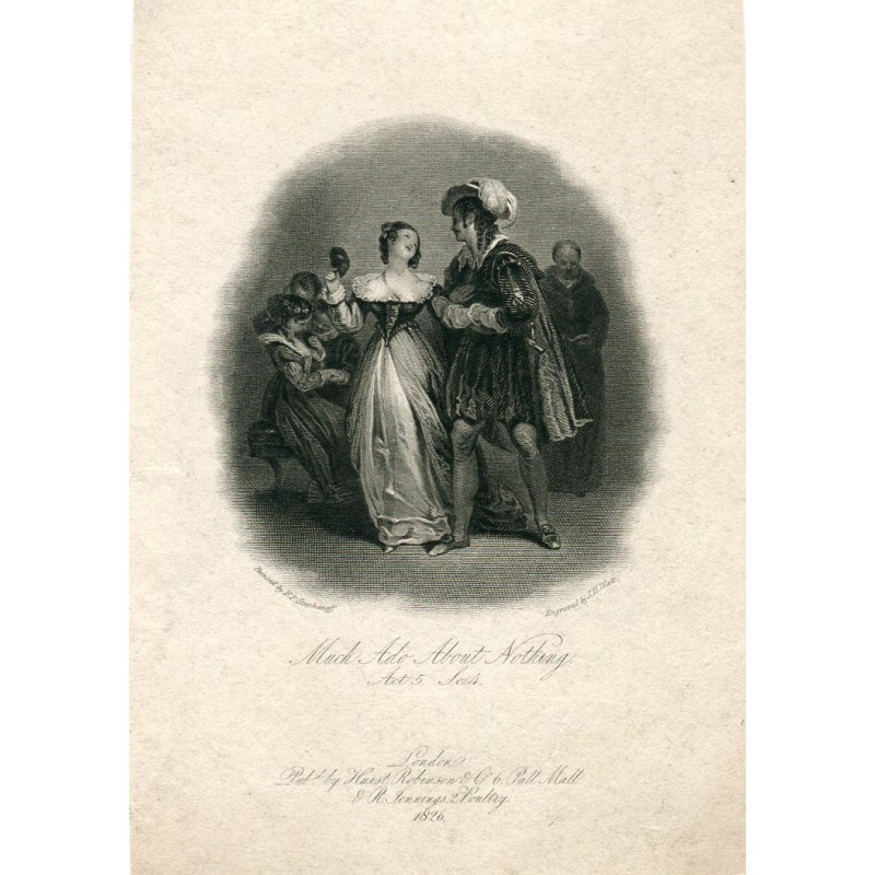 Grabado por J.H. Watt, pintó F.P.Stephanoff para la obra de Shakespeare Mucho ruido y pocas nueces. Publicado por Hurst Robinson. Medidas: 26,6x13,2 cms.Recipiente :