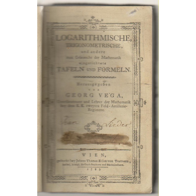 Descripción: 1783. Herausgeben von Georg Vega, Unterlieutenant und Lehrer der Mathematik bey dem K. K. zweyten Feld-Artillerie-Regiment, 1 vol. in-8 reliure d'époque pleine basane mouchetée, dos lisse ornée en long, Gedruck bey Johann Thomas Edlen von Trattnern, Wien, 1783, LXVIII-420 pp. Edition original. Raro ejemplar de la edición original de la primera tabla de logaritmos publicada por Georg Vega, la página 415-416 está rota y falta casi toda. Primera edición. Nombre del anterior propietario.Recipiente :