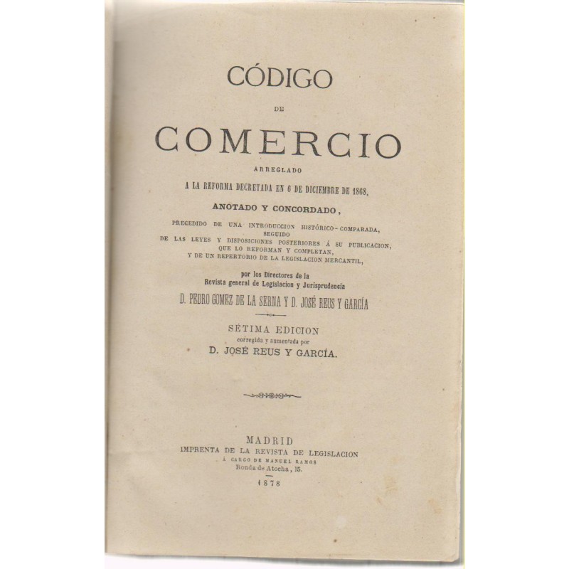 Codigo de comerciopor Pedro Gómez de la Serna y José Reus García. Arreglado a la reforma decretada el 6 de diciembre de 1868.