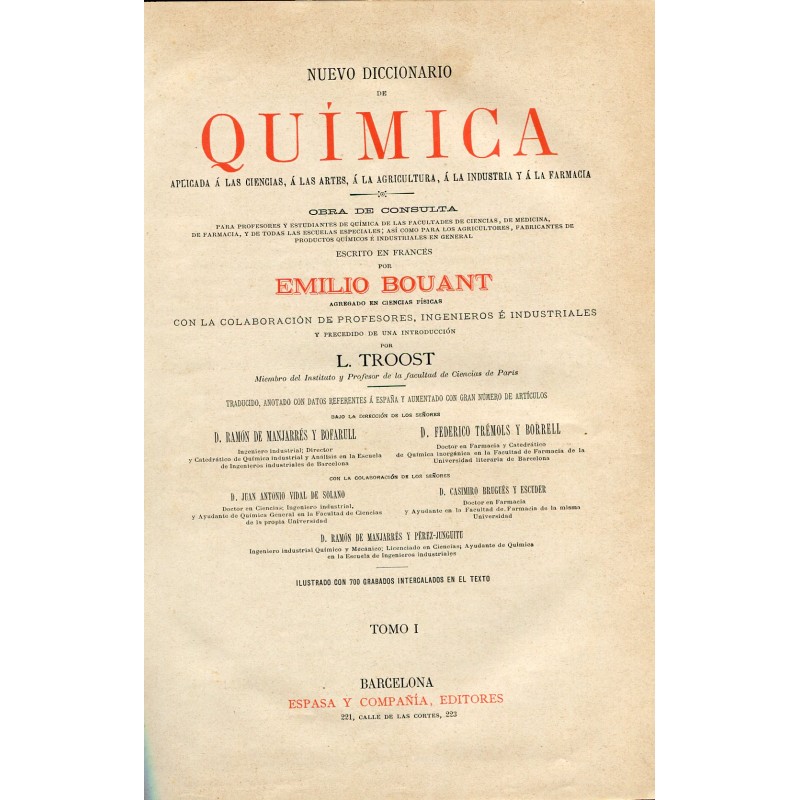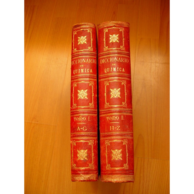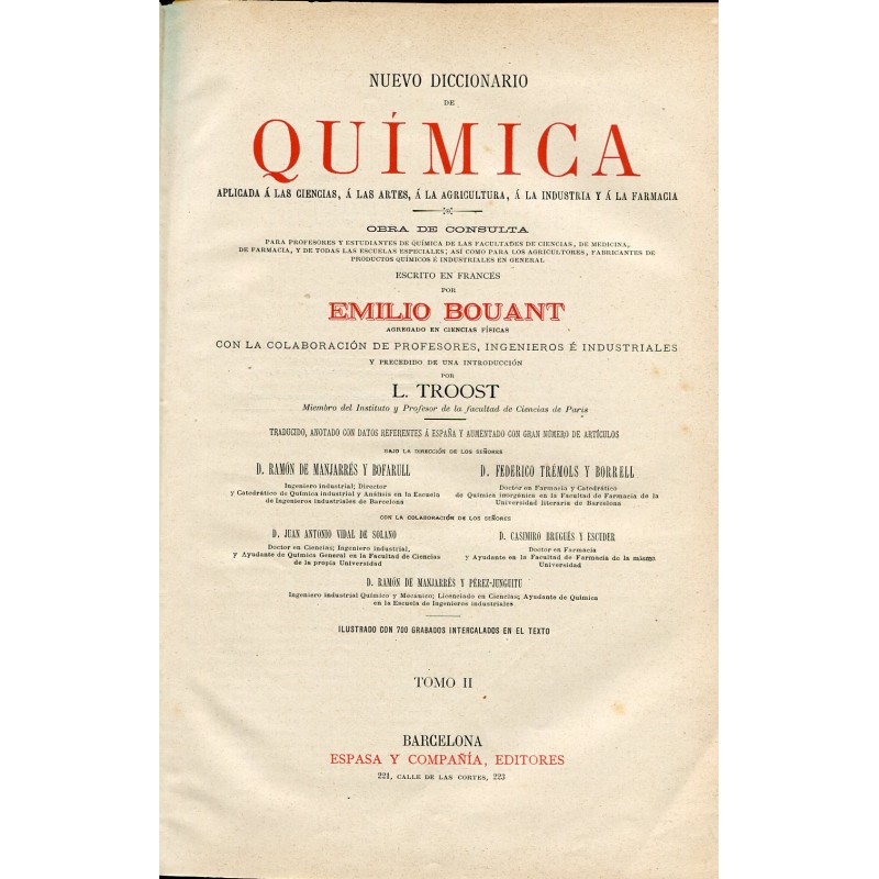 Nuevo diccionario de quimica aplicado a las ciencias, a las artes, a la agricultura, a la industria y a la farmacia por Emilio Bouant y con una introducción de L. Troost. 2 tomos. Editado en 1888 por Espasa y Compañia Editores. Encudernado en tapa dura con letras y motivos dorados. Contiene numerosos grabados. Excelente conservación. Miden 29,5x21 cms.Recipiente :