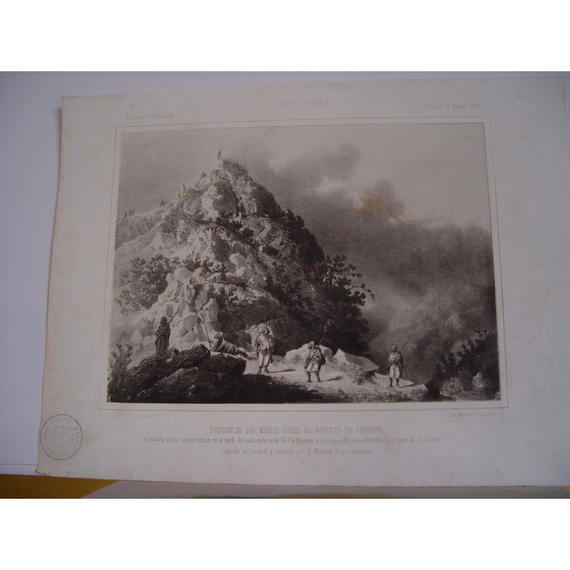Posición de los moros sobre el boquete de Anghera y avanzada que los mismos tenían en el fondo del valle, en la tarde del 7 de Diciembre a 1000 pasos del fuerte España, pero fuera de su alcanze. Copiada del natural y remitida por D. Manuel María Giménez. Campaña de África 1859-1860. En el dorso lleva un sello timbre de Madrid.medidas imagen: 19,4x25,9 cms.Recipiente :