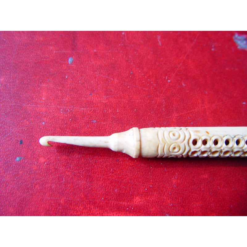 Punzón antiguo de ganchillo de marfil de 9,5 cms. de longitud. Al final tiene algún desperfecto.Recipiente :