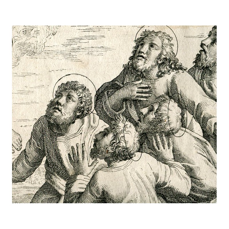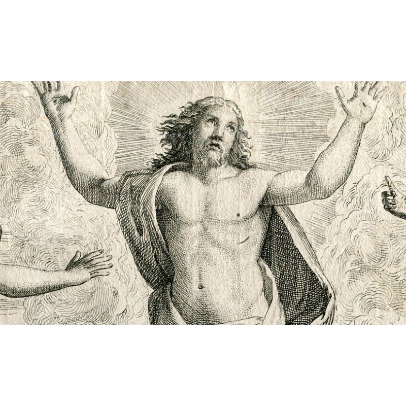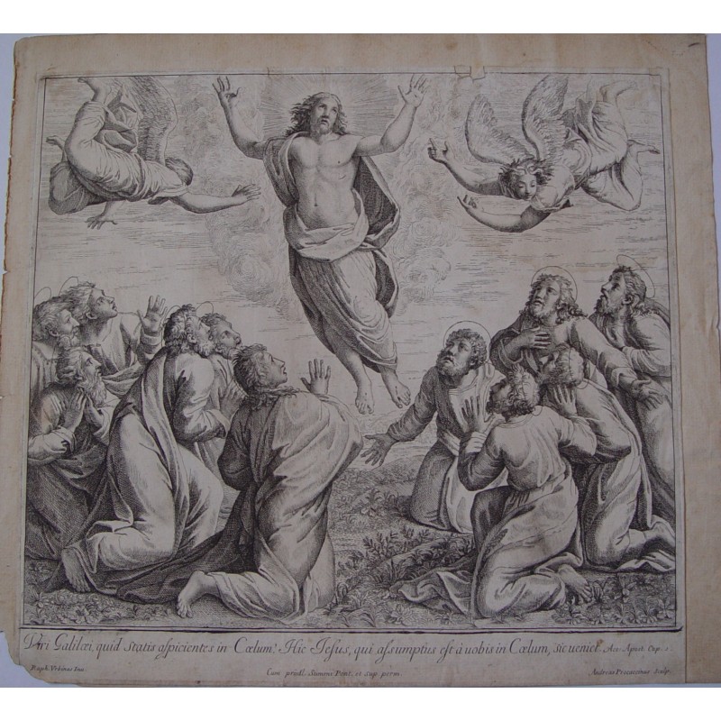 Ascensión; Cristo en el centro ascendiendo al Cielo, flanqueado por dos ángeles; con los discípulos arrodillados en primer plano. Grabador: A Procaccini (1671-1734) Artista: a partir de obra de Raphael (1483-1520) Medidas: 36x39,5 cms. Condición: Hay algunas manchas o imperfecciones en los márgenes debido a la antigüedad. Algún manchas que se aprecia en la imagen.Recipiente :