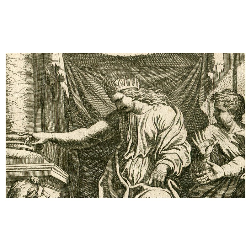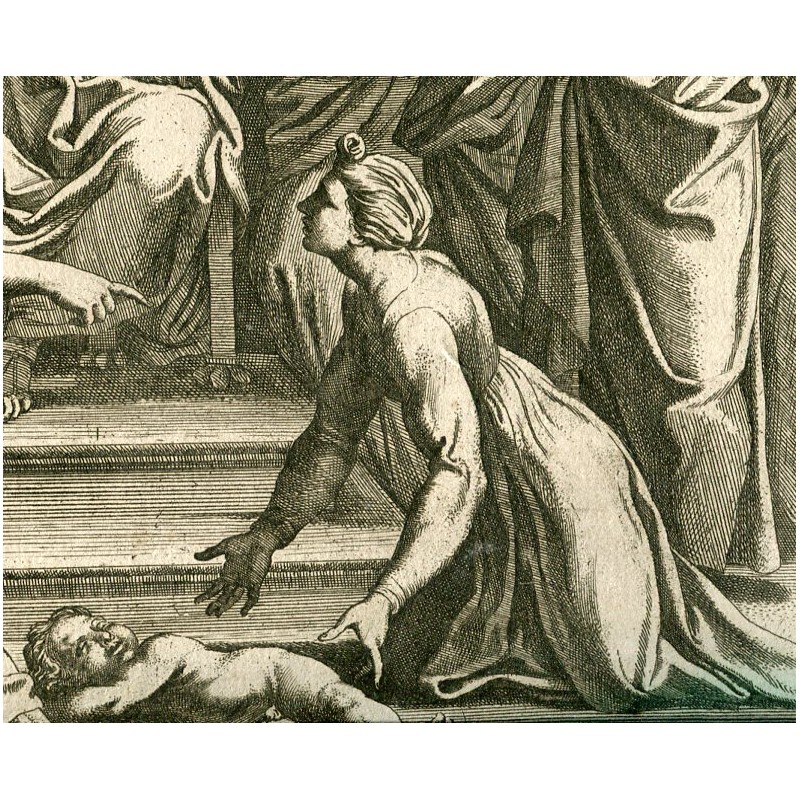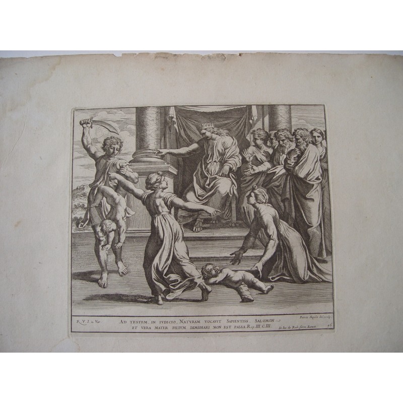 Ad testum in iudicio naturam vocavit sapientiss Salomon et vera mater filium dimidiari non est passa. Excente grabado del juicio de Salomón por Petrus de Aquila grabador del siglo XVII. Jacobus Rubeis, Roma. Medidas huella: 23x26 cms. Medidas papel: 37x48 cms.Recipiente :