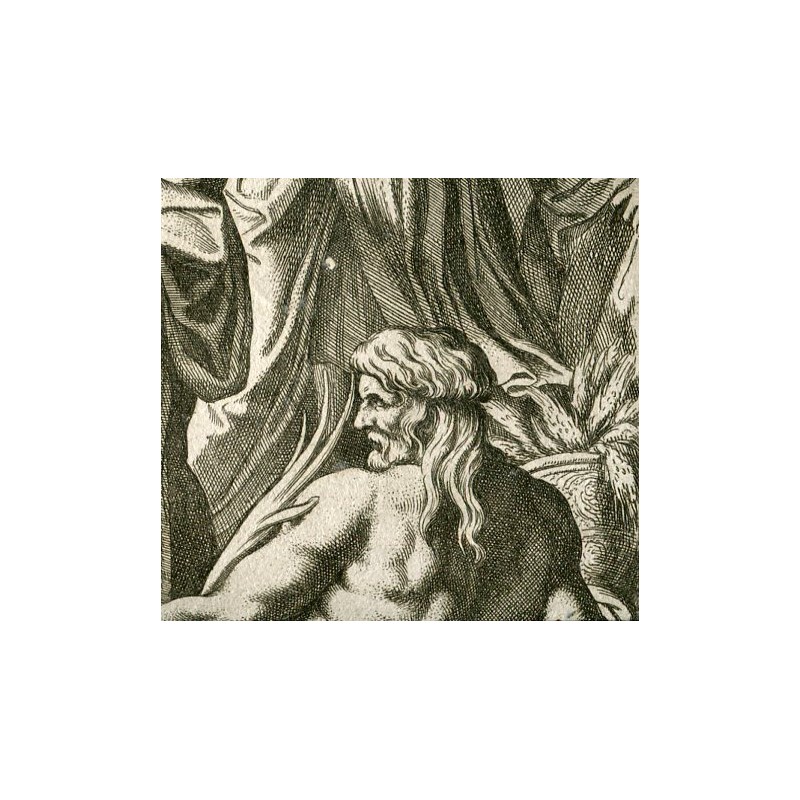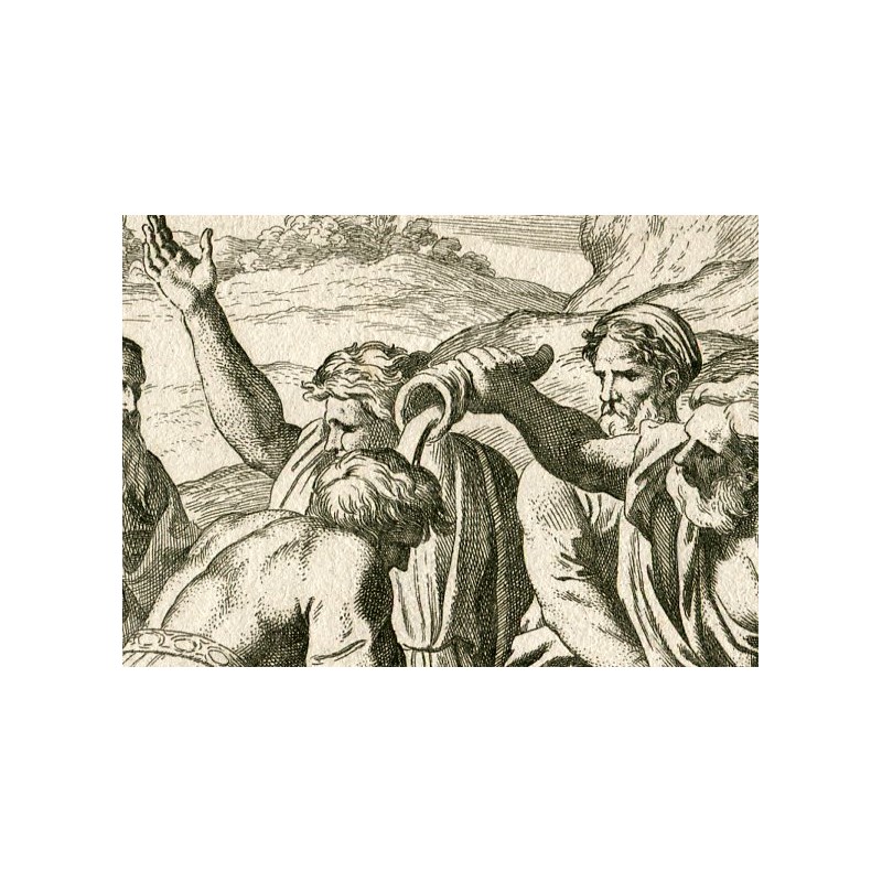 Grabado realizado por Petrus Aquila, Jacobus de Rubeis, Roma. Medidas huella: 24x28 cms. Medidas papel: 37x48 cms.Recipiente :