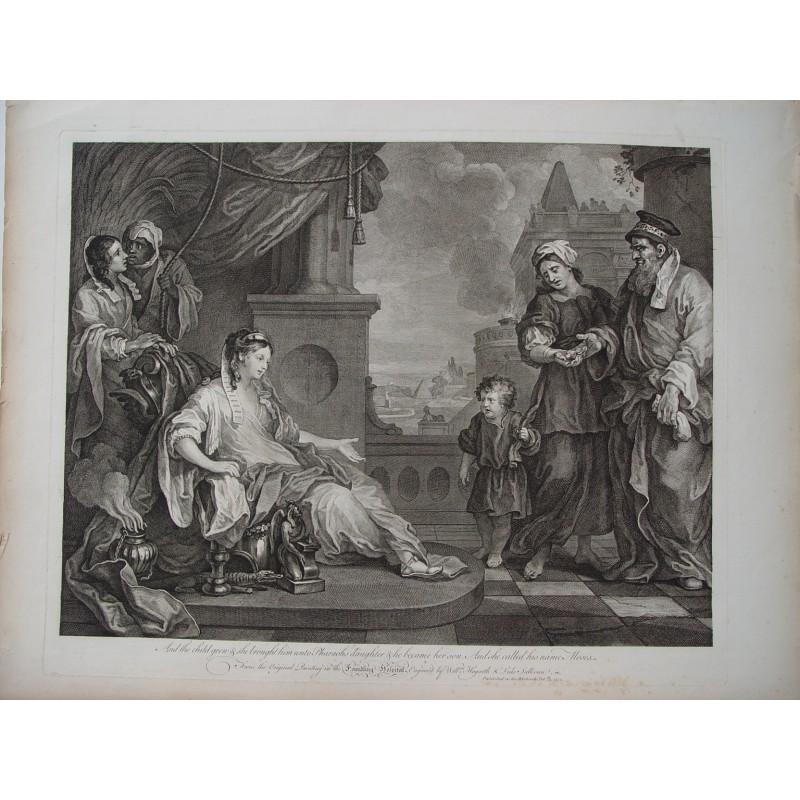 Título: Moisés llevado a la hija del faraón. Grabador y artista: William Hogarth (británico, Londres 16971764 Londres) Publicado por: Jane Hogarth (británico, 17091789) Marca de plancha: 42,5x53 cms. Tamaño del papel: 48x62 cms.Recipiente :