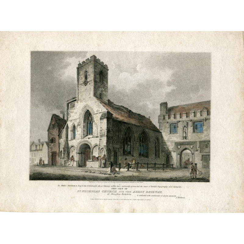 Grabado coloreado J.C. Smith sobre un dibujo de J. Neil porde St. Nicholas Church and the Abbey Gateway. Medidas: 27,7x20,6 cms.Recipiente :