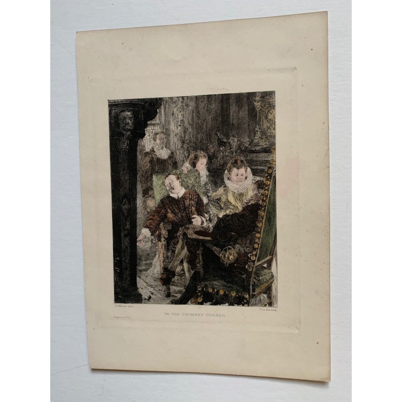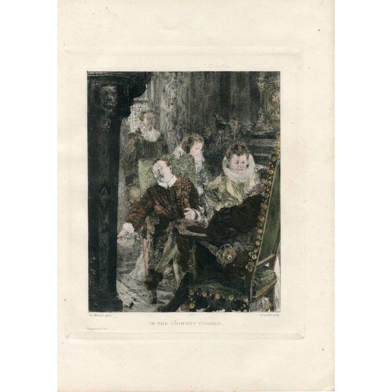 En el rincón de la chimenea (escena isabelina) grabado por P. Le Rat a partir de obra de una imagen de Adolf Menzel, publicado en la revista de arte, 1889. Artista: a partir de obra de Adolph Friedrich Erdmann (más tarde: von) Menzel (1815 - 1905) Grabador: Paul Edme Le Rat (1842-1892) Tamaño de la plancha 18 x 22 cms Tamaño del papel: 30x21,5 cms. En buena condición.Recipiente :