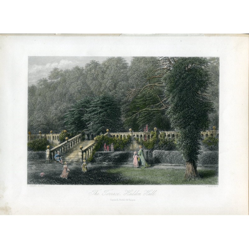 Título: La Terraza, Haddon Hall. Grabador: John Godfrey (británico, 1817-1889). Artista: a partir de obra de John Chase (británico, 1810-1879). Descripción: Grabado antiguo grabado en acero con color a mano reciente, sobre papel de gramaje extra. Fecha de producción: 1875. Estado: bien.Recipiente :