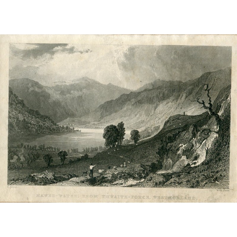 Grabado Hawes-Water from Thwaithe-Force, Westmorland realizado en 1834 por W. Le Petit, dibujó T. Allom. Grabado pegado a papel. Medidas: 11,6x16,7 cms.Recipiente :