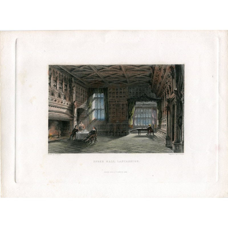 Speke Hall Lancashire grabado coloreado de 1834 por E. Challis, dibujó T. Allom