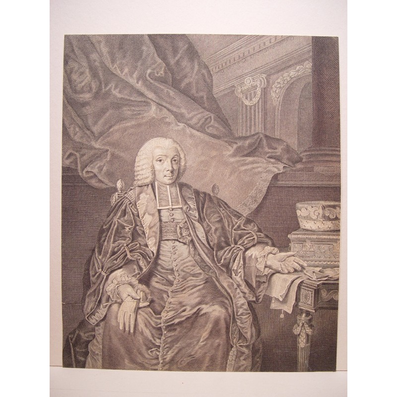 Gravure originale du XVIIIe siècle. Mesures de l'image 28x23 cm. Les marges sont coupées à l'intérieur de l'impression. Il a une pause (attachée à la hauteur de la main droite du personnage).Destinataire :