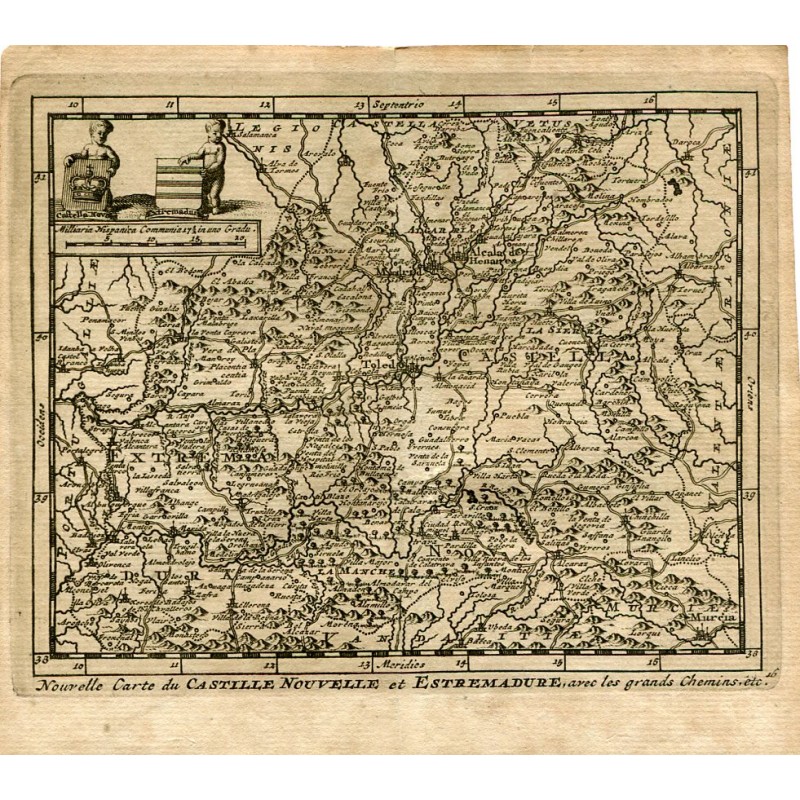 Nouvelle carte du Castilla Nouvelle et Extremadure avec les grands chemins, etc. Elle est issue de l'ouvrage de Pieter van der Aa Délices de Espagne et Portugal, publié à Leyde (Hollande) 1715, c'est l'ouvrage le plus illustré sur l'Espagne publié au début du 18ème siècle. L'image mesure 12,4 x 15,6 cm. Dimensions de la feuille : 15,5x16,5 cmDestinataire :